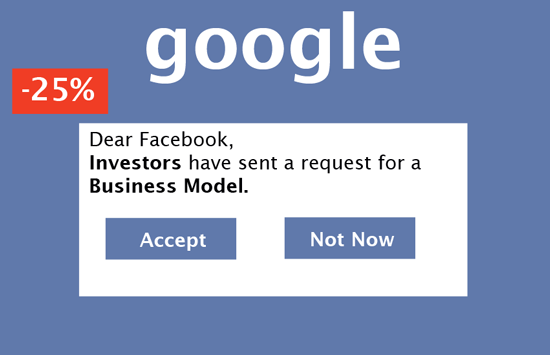 As the markets closed in New York, Google briefly replaced the stock chart with a message reading "Dear Facebook, Investors have requested a Business Model." followed by two options familar to those fileding Facebook friend requests; "Accept" and "Not Now".